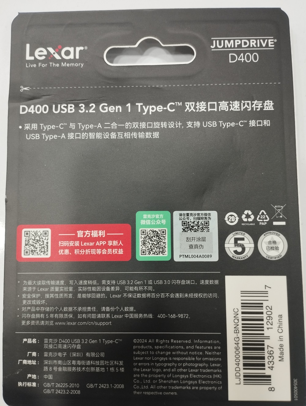 Lexar® JumpDrive® Dual Drive D400 USB 3.2 Type-CTM یک فلش مموری 2 در 1 است که به شما امکان می دهد محتوا را بین دستگاه های USB Type-CTM و Type-A خود به طور یکپارچه منتقل کنید. این درایو با بدنه فلزی شیک و طراحی چرخشی برای محافظت بیشتر، به همان اندازه محکم است که سرعت انتقال آن تا 130 مگابایت بر ثانیه است. این درایو با عملکرد پرسرعت USB 3.2 Gen1 و سرعت انتقال تا 130 مگابایت بر ثانیه خواندن، به شما امکان می دهد فایل های خود را به سرعت و به راحتی به تلفن هوشمند، تبلت و رایانه منتقل کنید. طراحی شیک محفظه فلزی با حلقه کلید، دوام فوقالعادهای را فراهم میکند و در عین حال از اتصالات در حین حرکت محافظت میکند. به راحتی یک گاوصندوق محافظت شده با رمز عبور ایجاد کنید که به طور خودکار داده ها را رمزگذاری می کند. و برای آسودگی خاطر، فایلهای حذف شده از گاوصندوق به طور ایمن پاک میشوند و قابل بازیابی نیستند. مقاوم در برابر آب، ضربه، گرد و خاک، شوک و لرزش